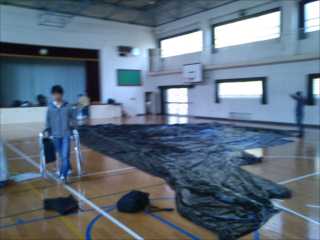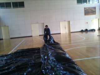 巨大なビニールと格闘するカジさん。
