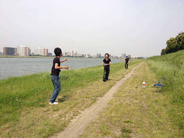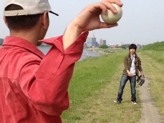 撮影終了後にキャッチボールする監督と主演の石田くん。