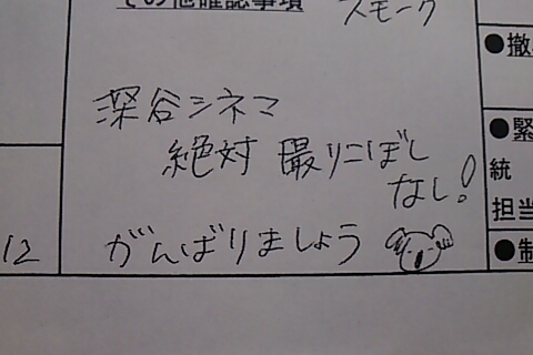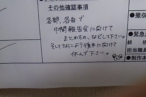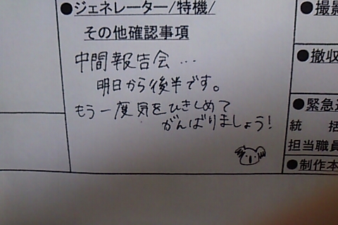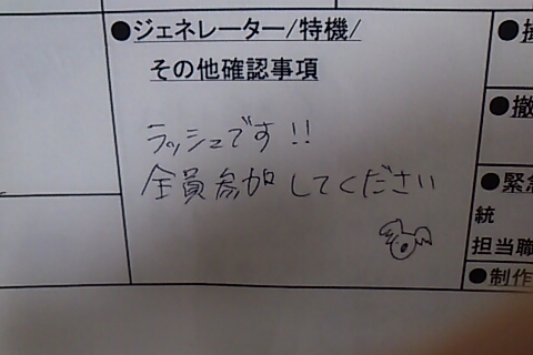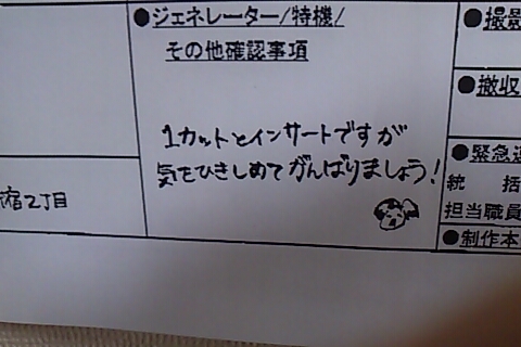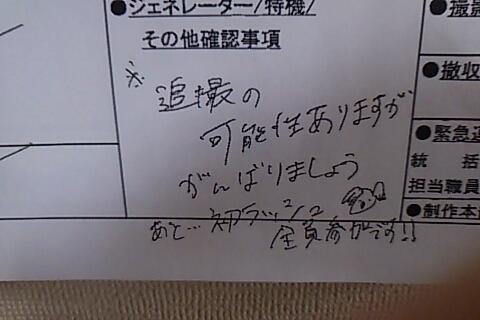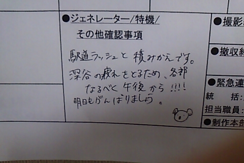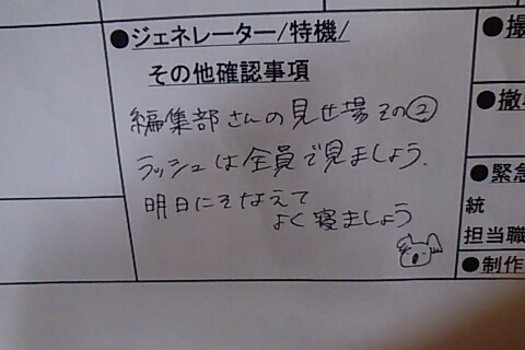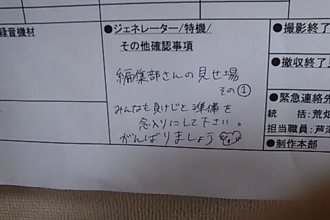ルリ「そうね。翌日の撮影予定表ってとこね。これを各技術部隊に届けて、それぞれ準備して貰うってわけ。開始時間、場面、シーンナンバー、出演俳優の「入り」時間、エキストラさんの人数、その他もろもろいろんなことが書いてある紙切れってわけ」