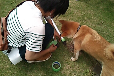 録音部隊のホソが作業をしていると、イヌのシュンスケくんがやってきました。
